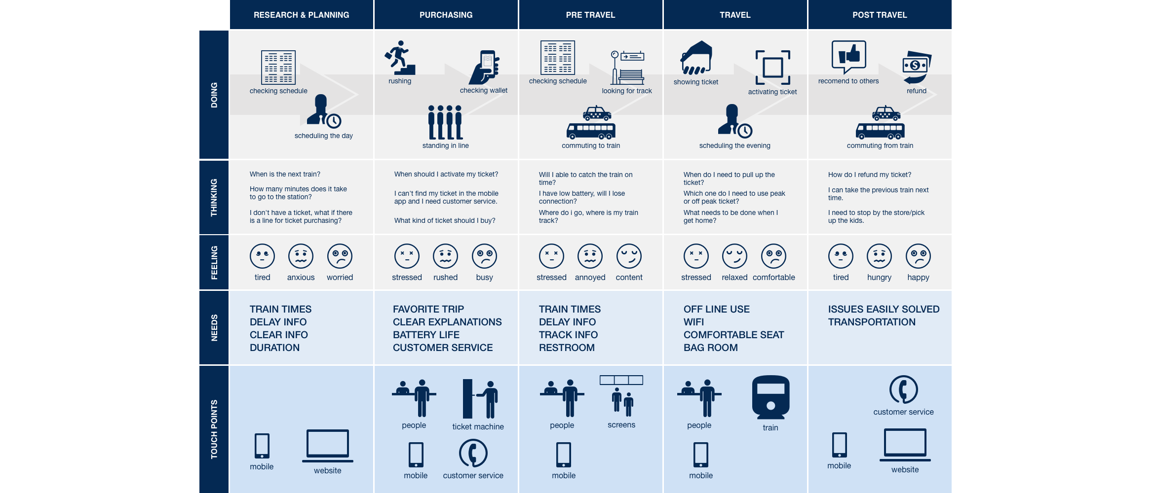 To understand our users even further, we prepared a detailed document with information on what people think, see, feel and do before during and after their commute. We really tried to get into their head and deeply empathize with the stressful moments of a commuter. We visualized this information into a customer journey map.