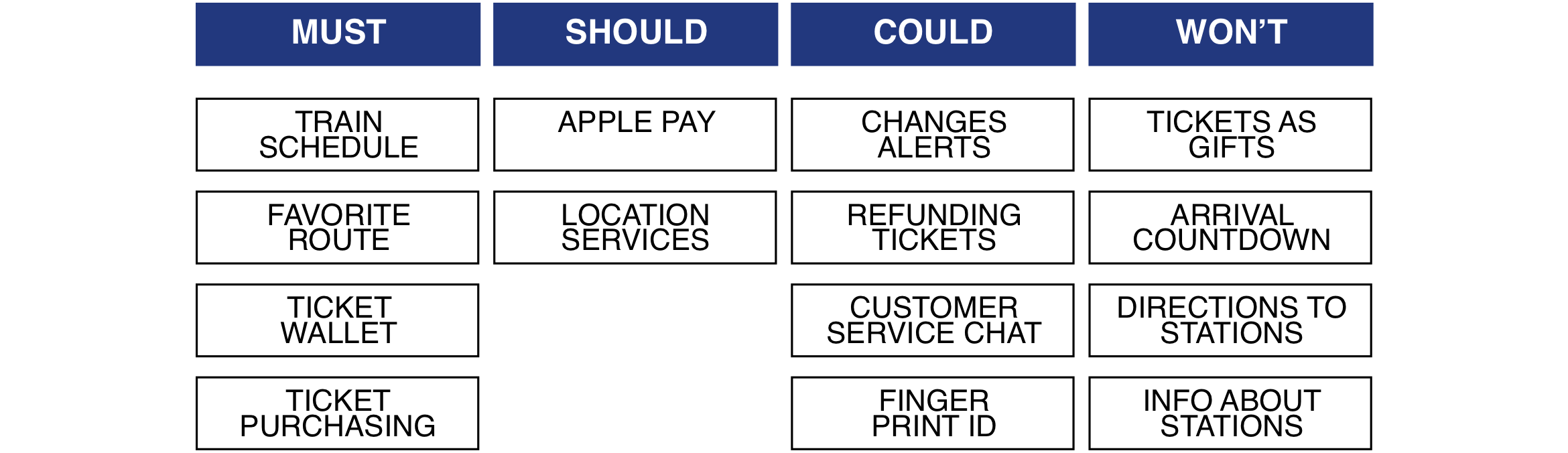 After organizing all research results and taking advantage of the Moscow method, we reached our viable product with the essential features. Based on our customer journey map and persona we had a better understanding of our users and how they would use this application to buy tickets and look up the train schedule which allowed us to create a user scenario. Combined with our findings from the Moscow method, user scenario led us to create an ideal path for an MTA e-tix app user. This design-thinking process led us to our next phase of creating wireframes.